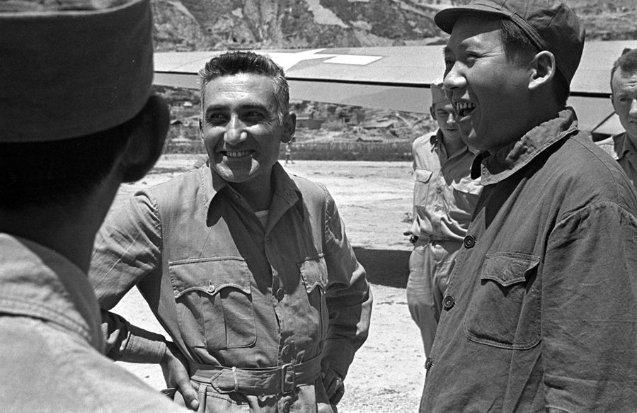 1944年,毛泽东同志和马海德在延安。在抗日战争和解放战争期间,马海德曾接待过许多到延安访问的外国记者、外交官、军人,包括1944年驻华美军司令史迪威将军派驻延安的美军观察组。 新华社图片