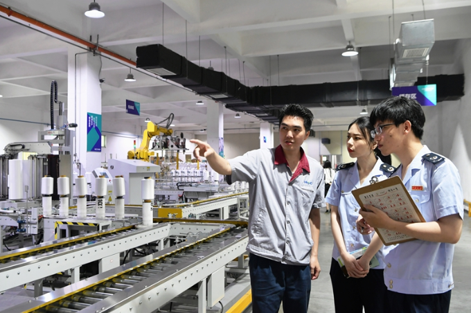 2023年5月31日,在福建省恒申合纤科技有限公司化纤自动化包装车间,国家税务总局福州市长乐区税务局工作人员(中、右)在了解企业的生产经营状况,积极落实各项减税降费及退税缓费政策。新华社记者 魏培全 摄